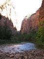 Da man auch mit der "Red Permit" das Auto am Hotel stehen lassen muss, machten wir uns auf zu einem der regelmäßig verkehrenden Shuttlebusse und fuhren zum Tempel of Sinawava. Hier beginnt der Riverside Walk, der - wieder der Name schon sagt - am North Fork Virgin River entlangt führt. Hier gibt es immer wieder Zugänge zum Ufer, um das kühle Nass aus der Nähe begutachten zu können. Nach ca. zwei Kilometern endet der Weg dann ebenfalls am Fluss, da man von hier nur noch weiter kommt, indem man sich die Füße nass macht. Dazu konnte man sich sogar irgendwo wasserfestes Schuhwerk leihen, was wir aber erst vor Ort entdeckten, da sehr viele Wanderer die gleichen Schuhe an den Füßen hatten. Auf der anderen Seite des Flusses führt der Weg weiter in die Berge hinein, und irgendwann wird es dort wohl immer enger und enger, bis man dann tatsächlich nicht mehr weiterkommt. Witzig war hier auch die Sammlung von Wanderstöcken, die hier an der Felswand lehnten, wo sich jeder Wanderer bedienen konnte, um noch mehr Halt auf den nassen und somit glitschigen Steinen zu haben. Da wir für diese Art von Wanderung leider nicht gerüstet waren, machten wir uns wieder auf den Rückweg.